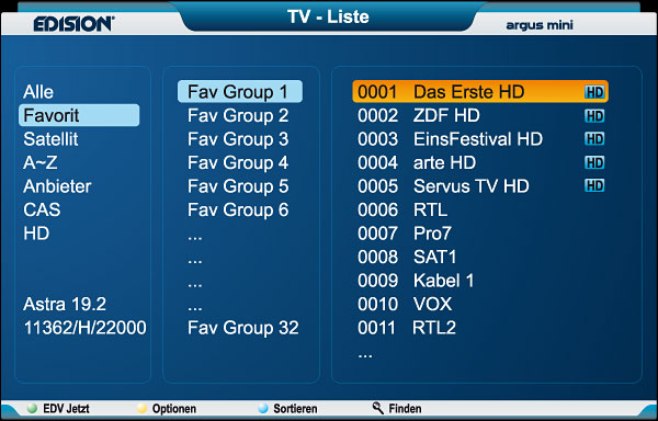 Haben Sie in der linken Spalte die Hauptgruppe 'Favorit' ausgewählt, können Sie in der mittleren Spalte durch Drücken der roten Taste, den Pfeiltasten oben/unten und der OK-Taste die Anordnung der Favoritenlisten verändern.