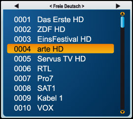 In der vereinfachten Ansicht der Senderliste wechseln Sie mit den Pfeiltasten links/rechts zwischen den Favoritenlisten, mit den Pfeiltasten oben/unten blättern Sie in der Liste zeilenweise, mit den Tasten Page+/Page- blättern Sie seitenweise. Durch Drücken der OK-Taste wird der gewählte Sender zum aktiven Sender.