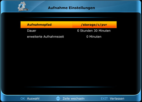 Aufnahmepfad: | Drücken Sie die Taste OK, um einen anderen Speicherort für die Aufnahmen einzustellen. In der u.U. angezeigten Ordnerstruktur navigieren Sie mit den Pfeiltasten oben/unten und der Taste OK zum Öffnen von Ordnern. Mit der roten Taste bestätigen Sie einen Ordner, mit der gelben Taste können Sie nach Auswahl des Eintrages 'Neuer Ordner' einen neuen Ordner anlegen. Es erscheint ein Fenster mit Eingabefeld und folgenden Funktionen: Mit der blauen Taste löschen Sie den kompletten Inhalt im Eingabefeld. Mit der grünen Taste navigieren Sie im Eingabefeld zum vorherigen Zeichen, mit der gelben Taste zum nächsten Zeichen. Mit den Pfeiltasten und der Taste OK wählen Sie Zeichen und Buchstaben aus. Sie können mit der weißen Taste die Eingabemethode ändern. Durch Drücken der roten Taste bestätigen Sie Ihre Eingabe.
